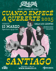 Santiago, marzo de 2025 — Luego de recorrer de norte a sur distintas ciudades de Chile, Gamuza se prepara para cerrar con broche de oro su exitosa Gira Verano 2025 con un concierto imperdible el próximo 15 de marzo en Sala Los Leones, Recoleta. Este evento especial marcará no solo el fin de su primera gira nacional, sino también el anuncio oficial de su nuevo disco y próximos lanzamientos.